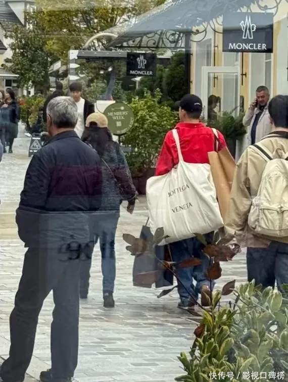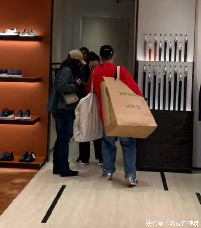 郭晶晶与旁边穿着红色衣服的男子在说话,他身上背着2个超大的购物袋。看来,郭晶晶这一次来BV专柜里收获很丰富。