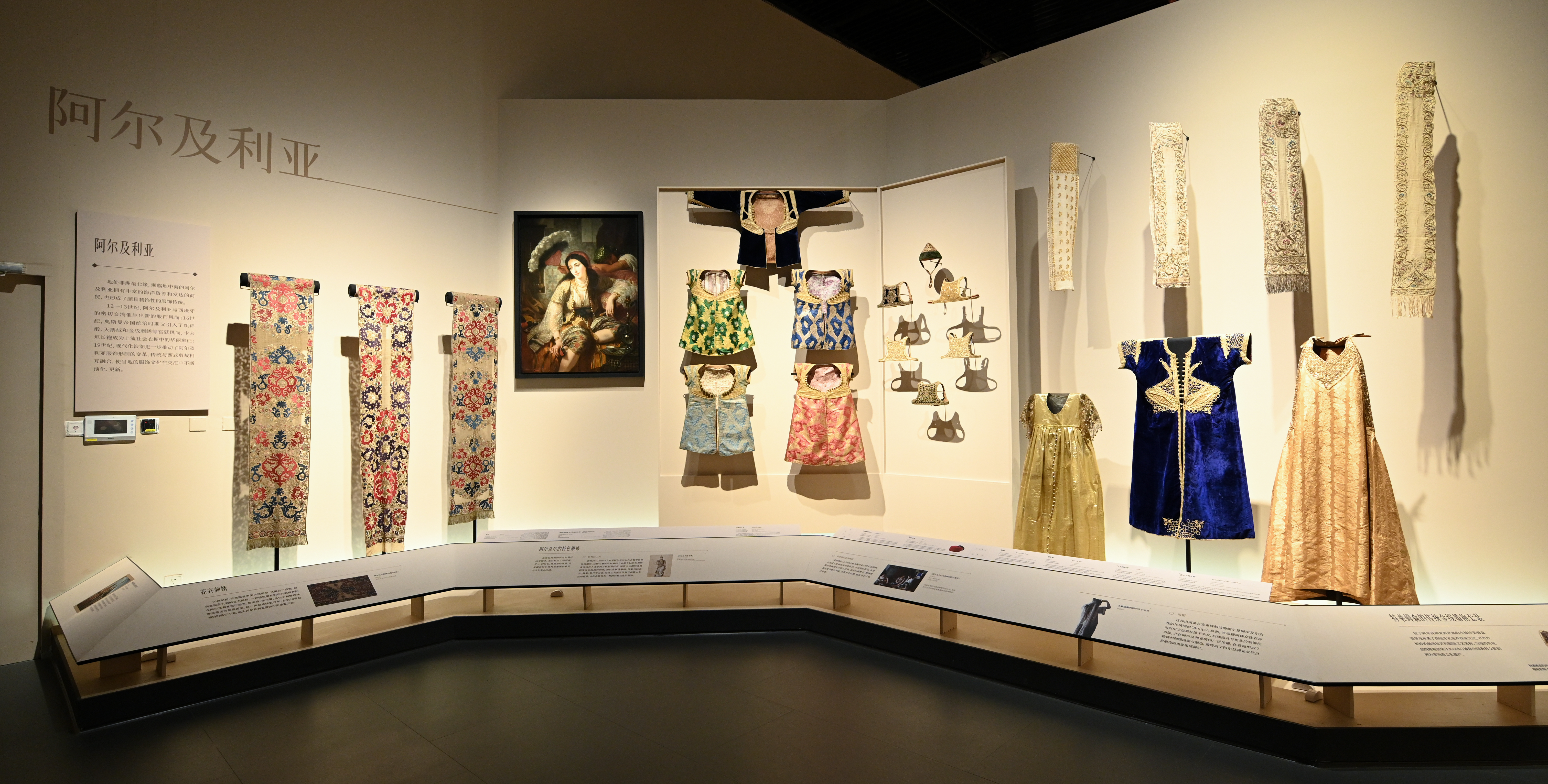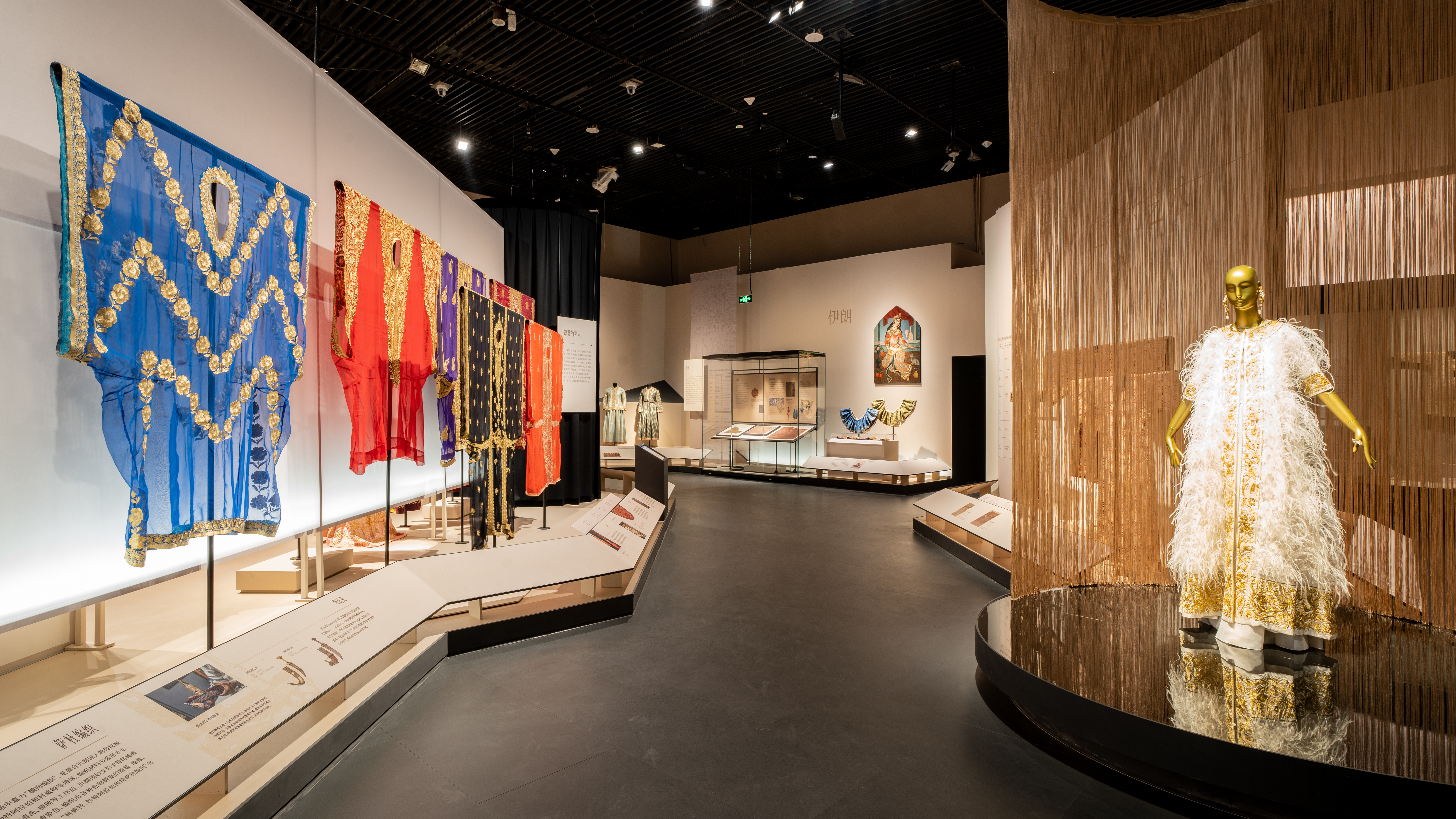 “黄金,自古以来由于其稀缺性和光芒,广受人们的追捧。在不同地域、不同文明的服饰中,都有织金锦或刺绣的存在。”展览现场,执行策展人张晨旖介绍,展览分为“日落金辉:马格里布的明亮服饰”“沙海星穹:中东地区的织金艺术”“天方织韵:阿拉伯半岛的信仰美学”“绫罗生香:印度与东南亚世界的金缕华裳”“经纬鎏光:东方丝国的金色记忆”五个单元,通过织金技艺、服饰艺术、审美源流等多维视角,连缀起一幅丝路金线服饰文化延绵不断、欣欣向荣的璀璨图景。