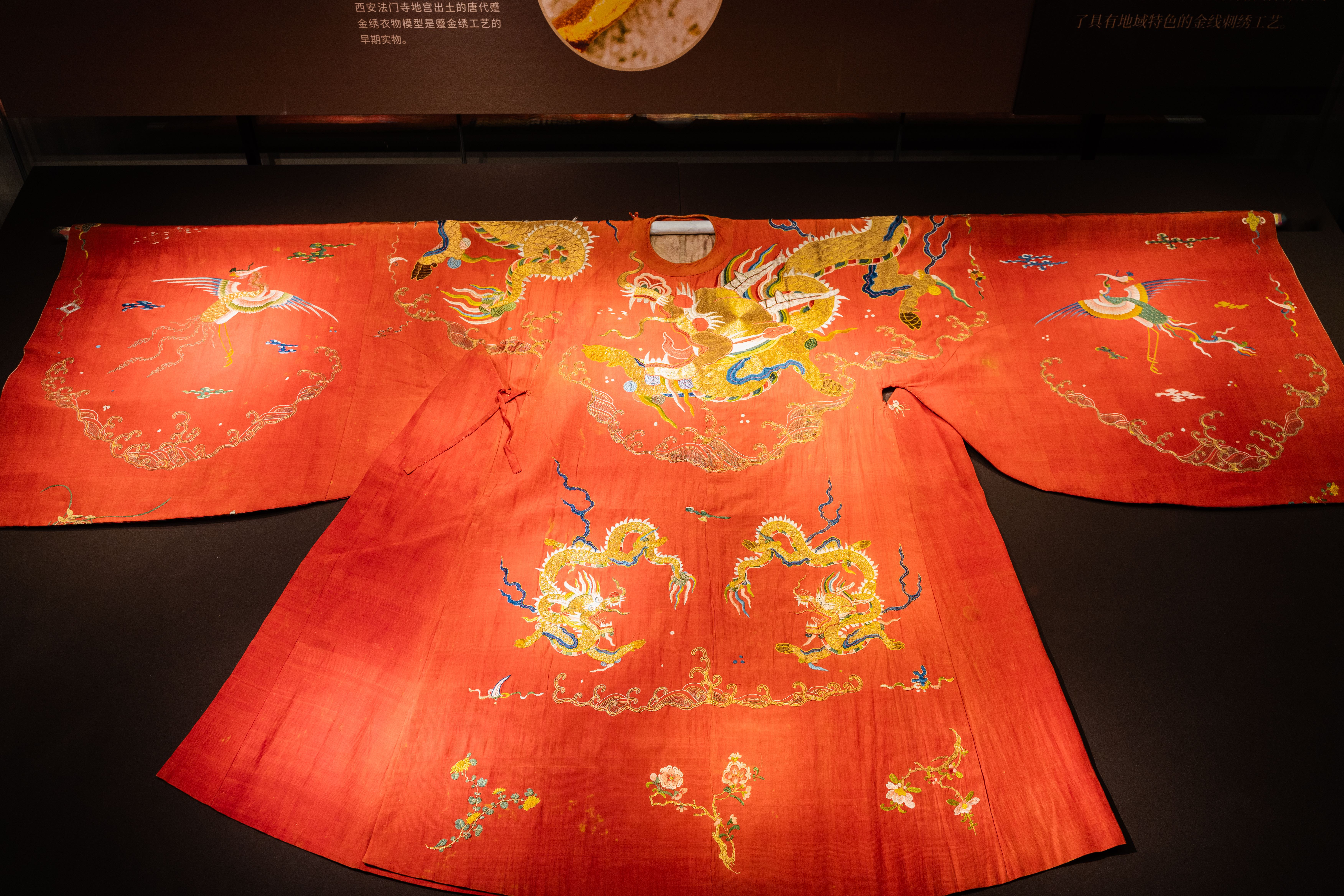 而作为“东方丝国”的中国,金线是衣冠之上的礼仪典章。在展览的第五单元,元代织金奔鹿残片、明代大红色绸绣过肩麒麟鸾凤纹女袍、清代的黄地流云蝙蝠纹妆花龙袍等重磅文物亮相,诠释着“衣以载道”的文明精髓。