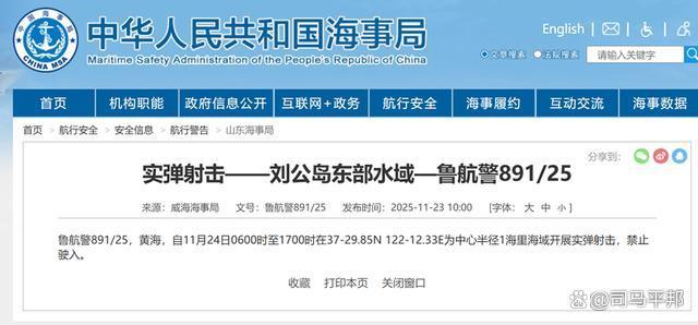 11月23日,大连海事局发布警告,从11月23日16时到12月7日16时,在渤海海峡黄海北部部分水域执行军事任务,持续时间长达两周。与此同时,威海海事局发布航行警告,11月24日6时至17时,在刘公岛东部水域开展实弹射击。